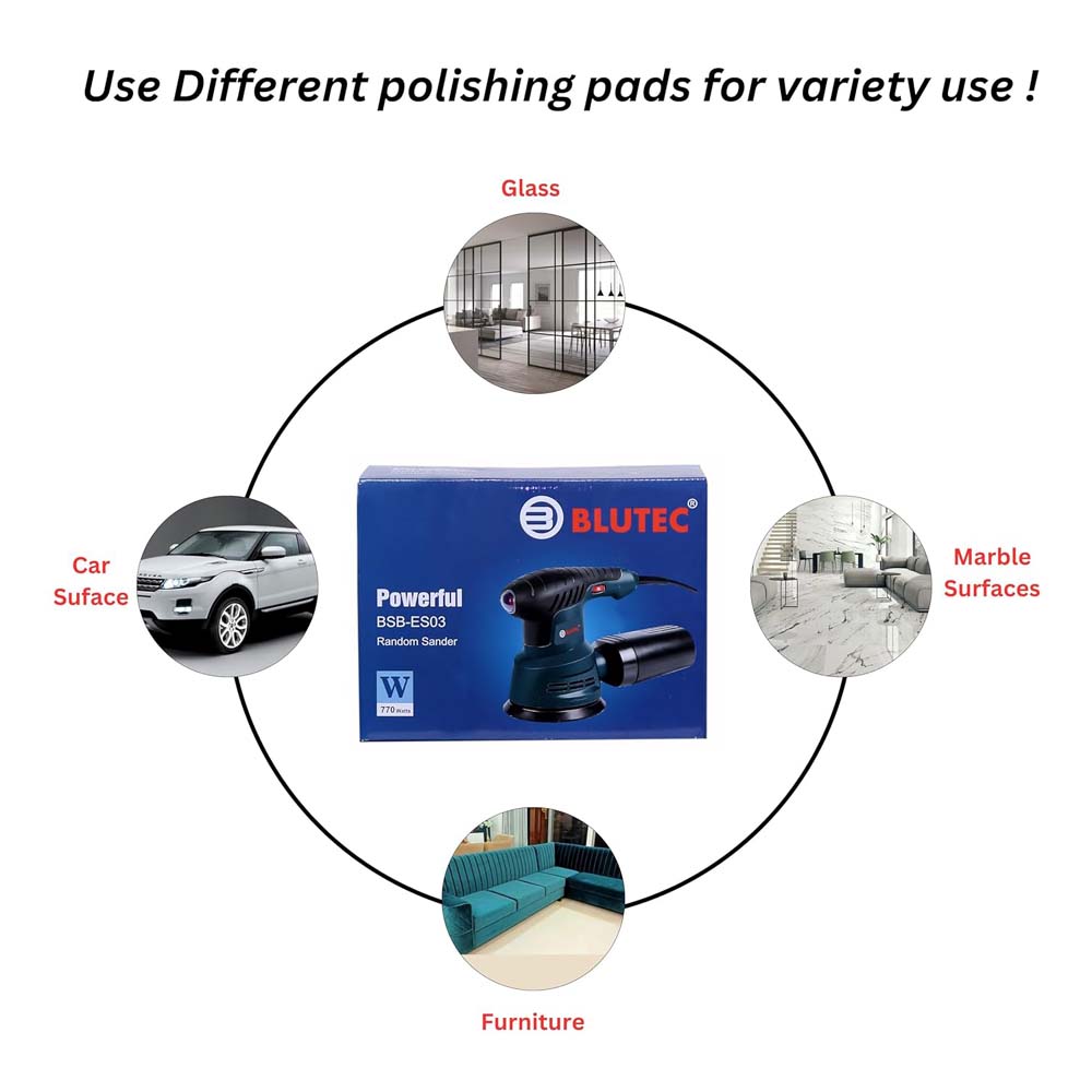- How to Use?- To use the Blutec Orbital Random Sander, first secure the appropriate sanding disc on the 5-inch plate. Set the speed from 1 to 6 based on the material, choosing lower speeds for finer work and higher speeds for tougher surfaces. Grip the tool firmly and start sanding, moving it gently in a circular or overlapping motion to achieve an even, smooth finish. Connect the dust box to the dust port to collect dust and maintain a clean workspace during sanding.