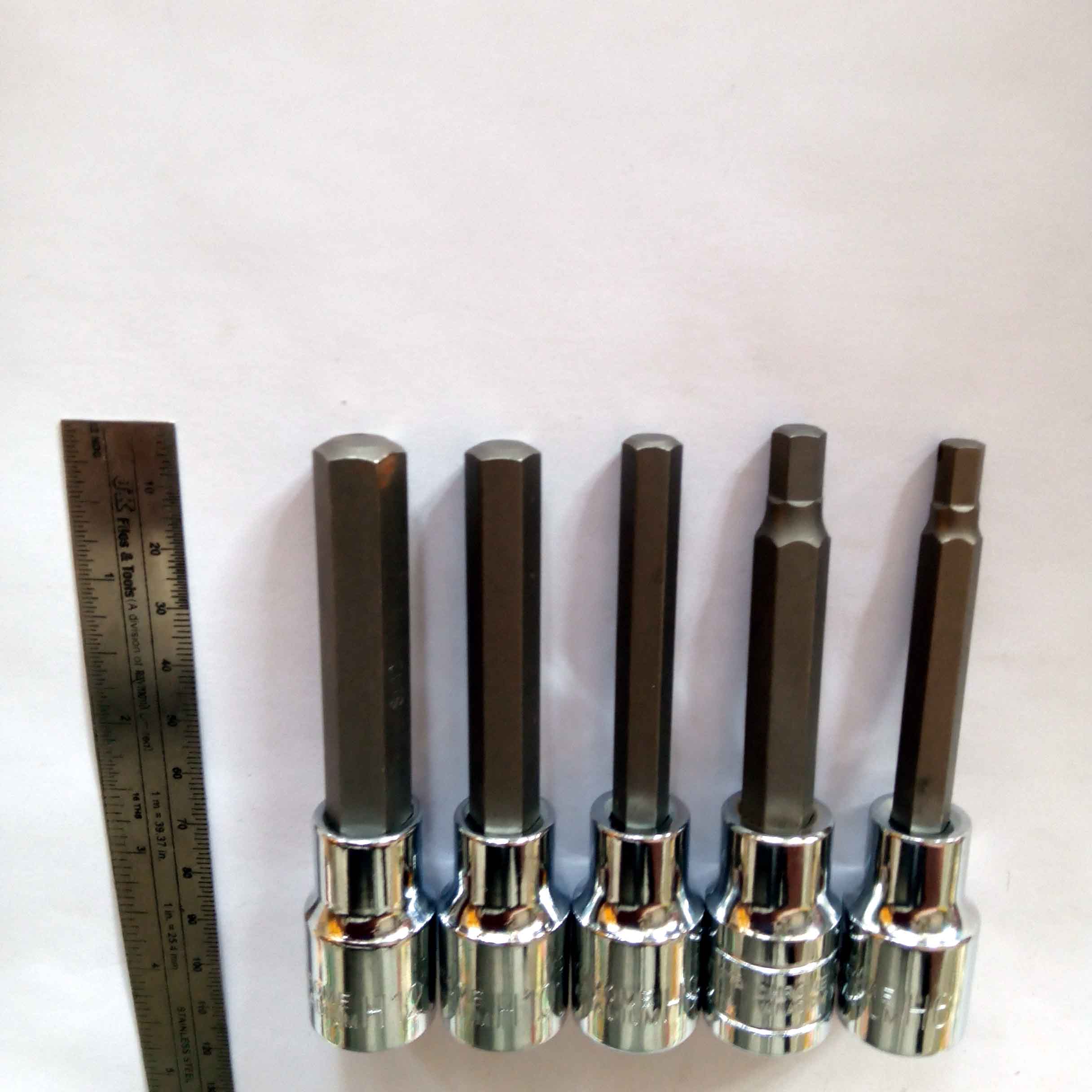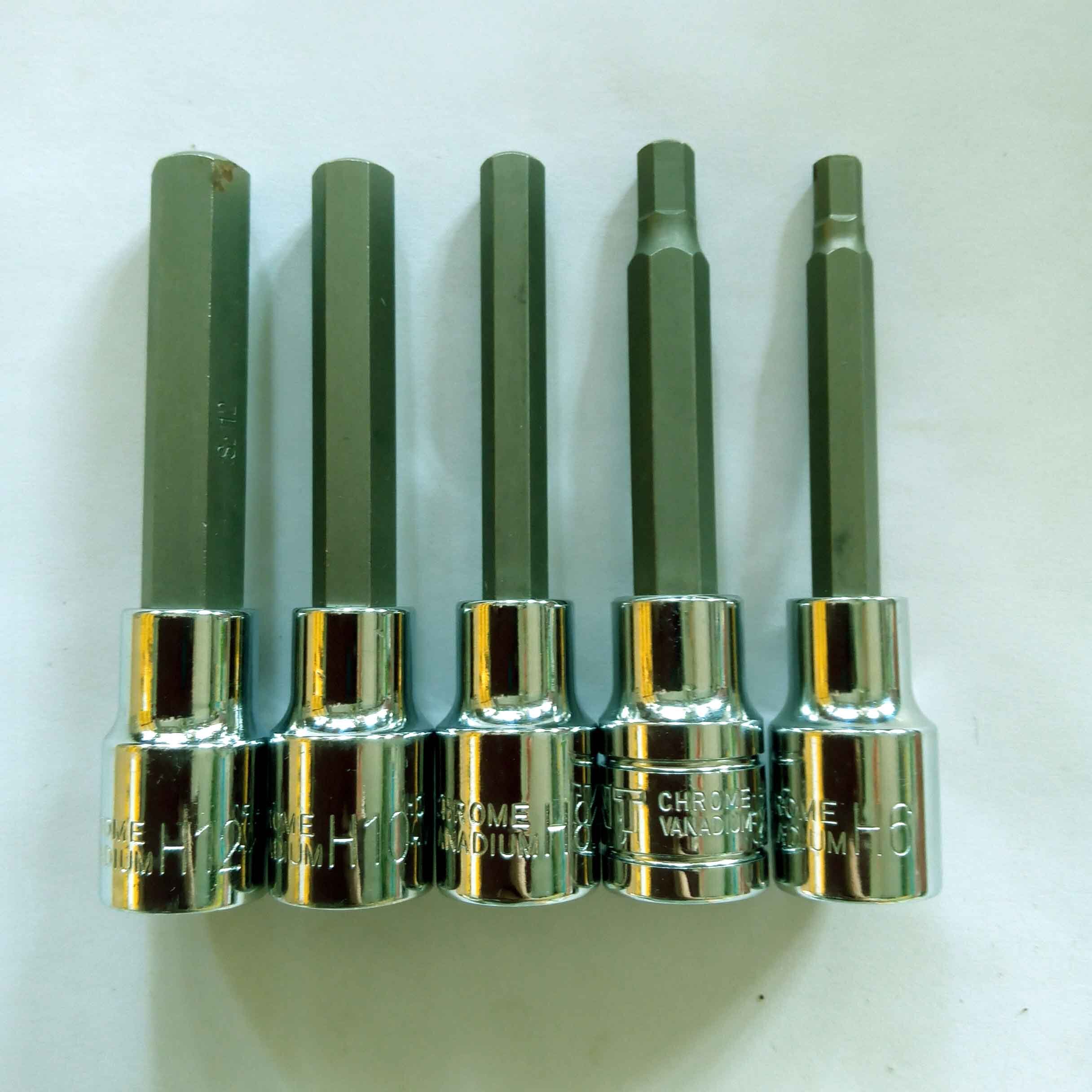 - Package contains combo set of 5 Pcs HEX Bit Socket 1/2″ Sq. Drive Socket Bits – Long -100mm (H6), (H7), (H8) ,(H10), (H12) Impact Bits Hex Shank.